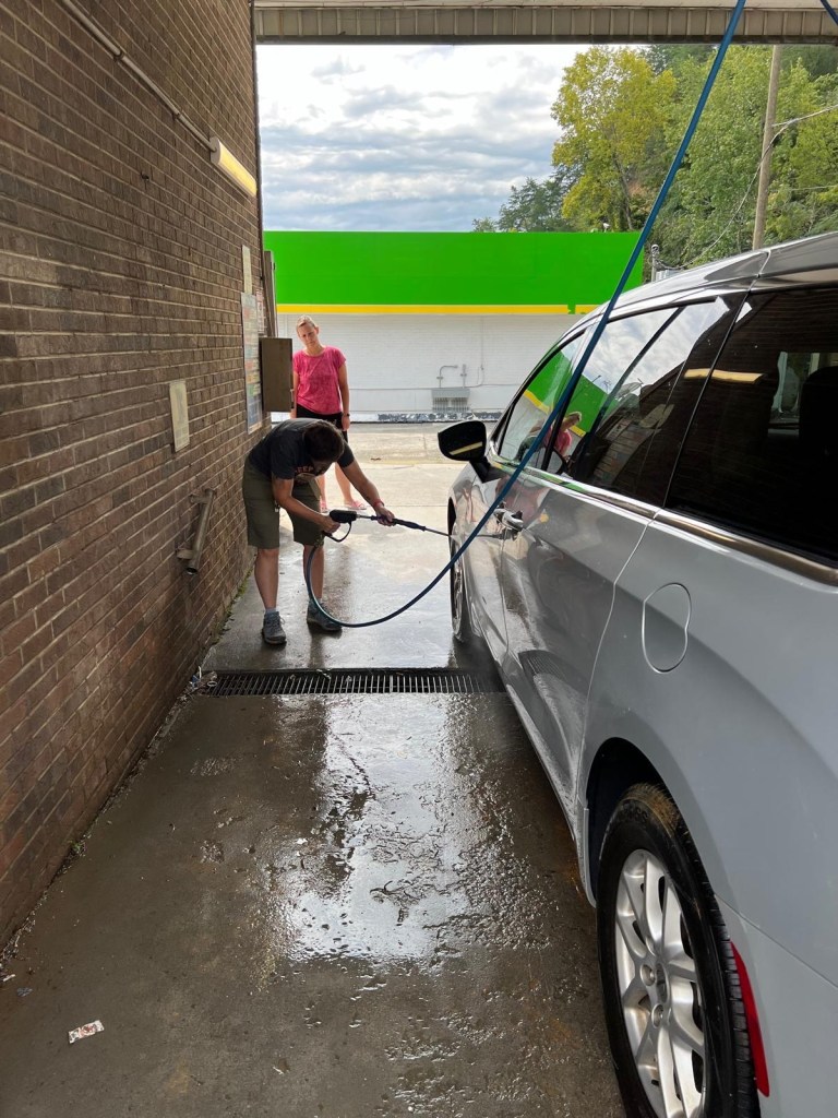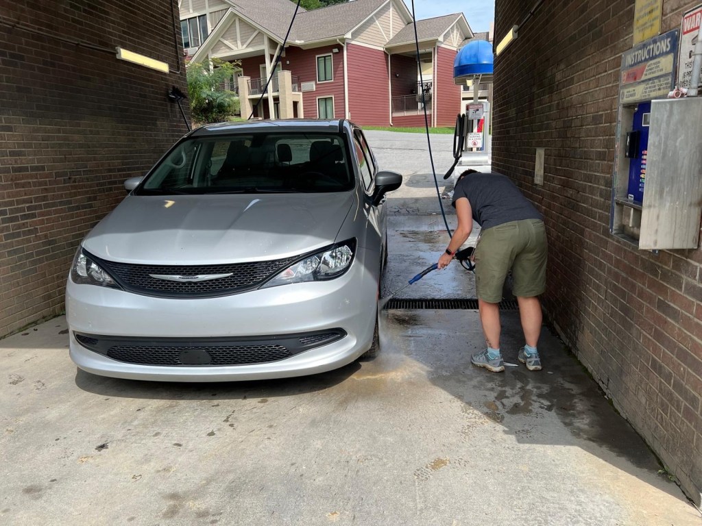 Terwijl Jeanine en Viviane zorgden voor de afwas, ging ik samen met Vanessa en Wanda naar de carwash. De wielen van onze auto waren immers bedekt met een dikke laag modder en dat zou het niet veilig maken om te rijden. Bij de carwash lachte het geluk ons een beetje toe, want er was iemand een rolletje quarters vergeten (en we waren er helemaal alleen). We konden dus bijna gratis de auto kuisen.