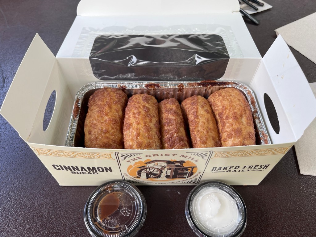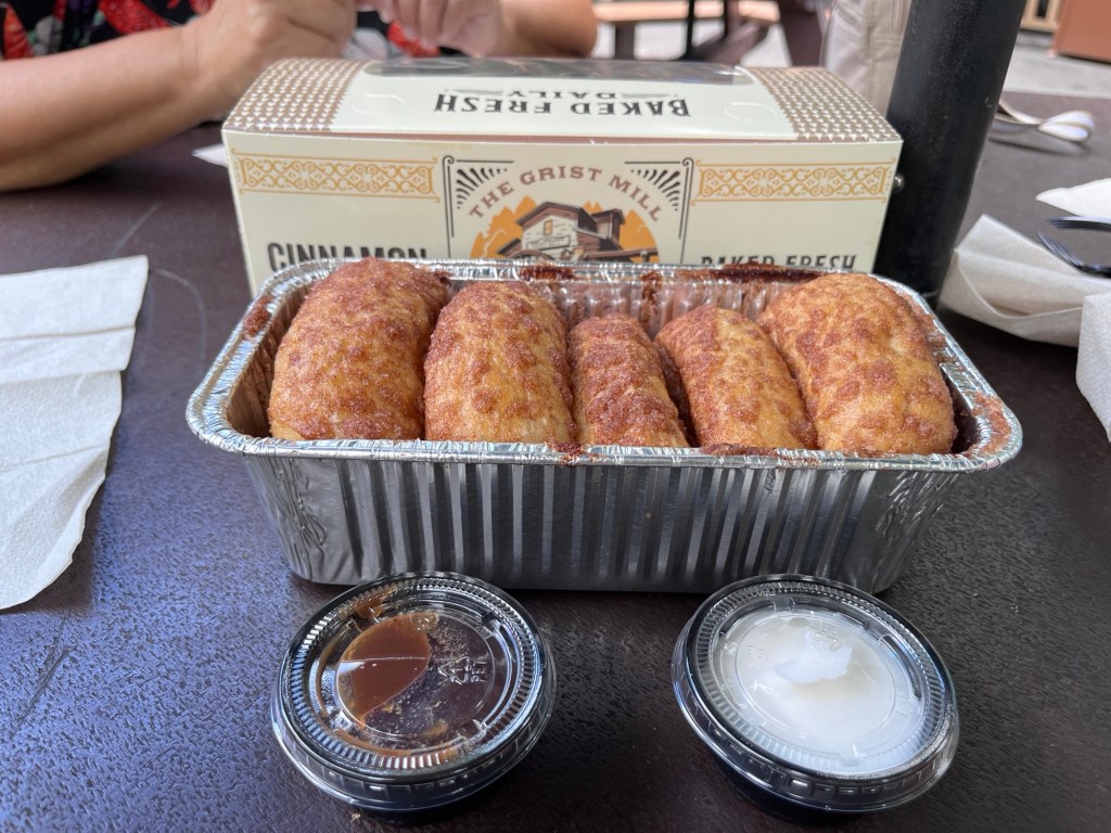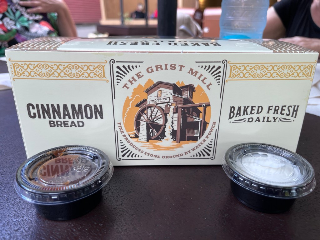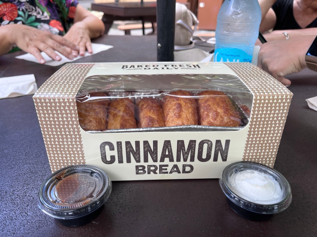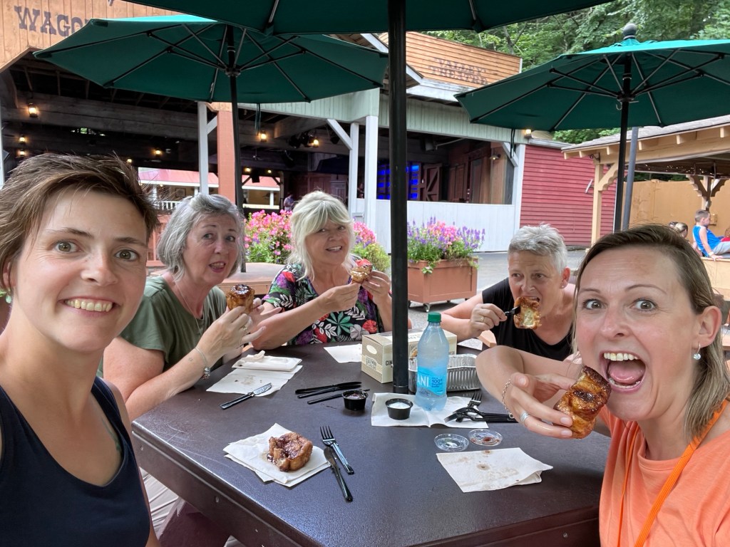 Bij de meesten kwam een klein hongertje op en we besloten om eens het befaamde cinnamon bread uit te proberen. Pretparkgangers die hier al jaren komen zijn er verzot van en het is blijkbaar een must om eens te proeven. We kochten één brood voor ons vijven, zo had iedereen net één stukje. Het resultaat van onze tasting? Gewoonweg fantastisch!