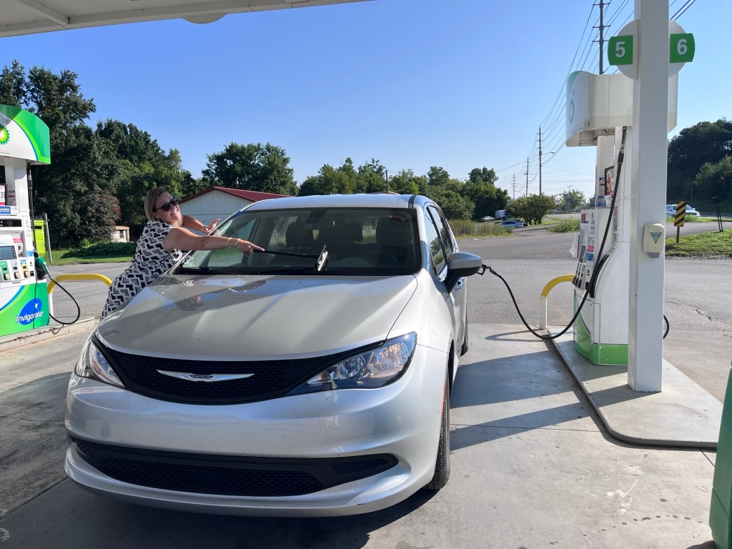 Deze ochtend moesten we jammer genoeg afscheid nemen van ons Tennessee Mountain Home! Ons Molly zal het vanaf nu zonder ons gezelschap moeten doen… Net zoals Dolly Parton in 1964, lieten ook wij de Smoky Mountains en Pigeon Forge achter ons en reden we richting Nashville, home of country music and music capital of the world! Klaar om het helemaal te maken! Vooraleer we begonnen aan onze autorit van 375 km, gaven we onze Voyager eerst nog de nodige drank voor onderweg en zorgden we voor extra bandenspanning (zwaarder geladen vanwege de vele Dolly-souvenirs?).