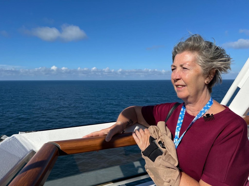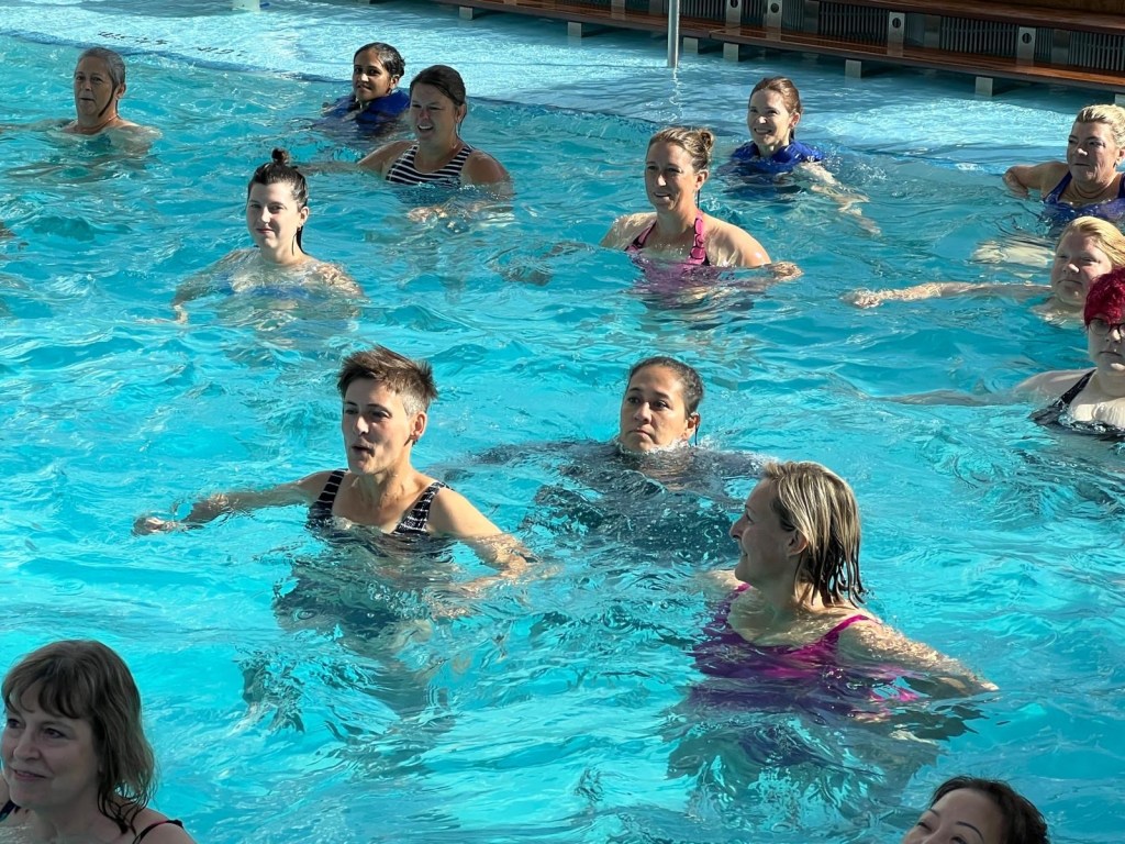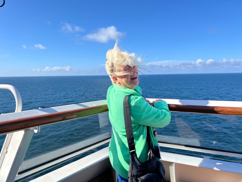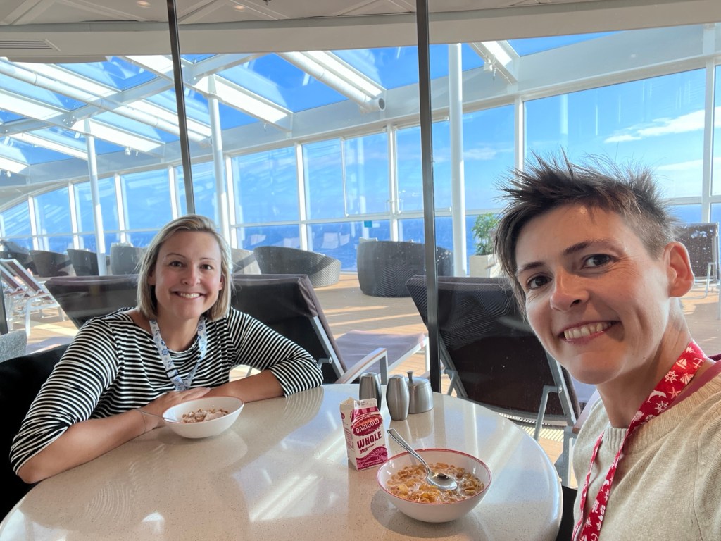 Vanessa en ik besloten dan maar om ons snel aan te kleden, jasje aan te doen en op verkenning te gaan. Om 06.30 uur stonden we zo op het bovendek (dek 14) om een toertje te maken op een (op dit uur nog bijna) leeg schip. De looppiste had alvast wel veel trek deze vroege uurtjes, al kon je deze best tegen de richting afleggen met de wind in de rug. We stopten even bij de Solarium Bistro voor een snelle hap omdat we ons hadden opgegeven voor de aquagym in het binnenzwembad. De work-out (gegeven door Aaliyah uit Zuid-Afrika) duurde ongeveer 30 minuten en we werden aan de zijlijn aangemoedigd door Viviane en Wanda. De redder van dienst hield ons heel goed in het oog en moest af en toe ook zijn lach inhouden bij de uitvoering van sommige oefeningen.