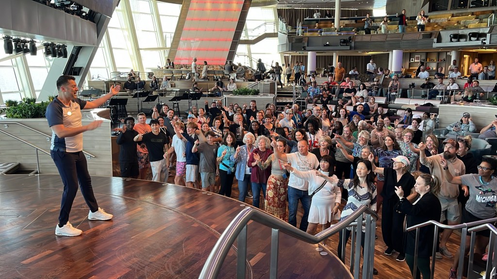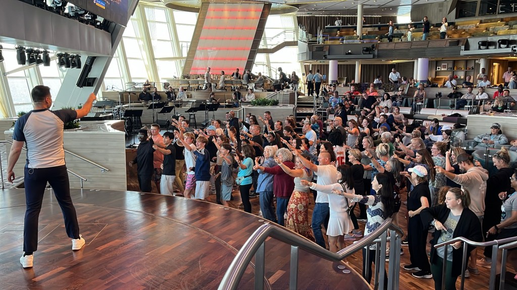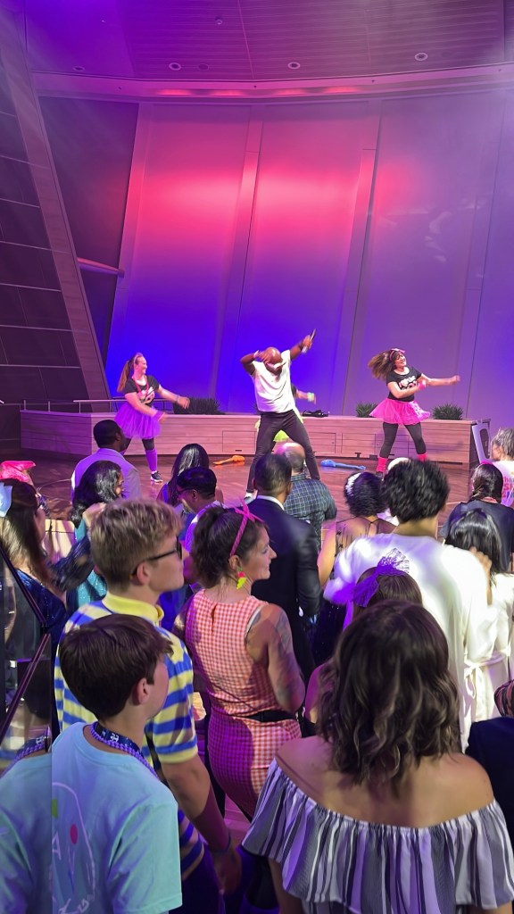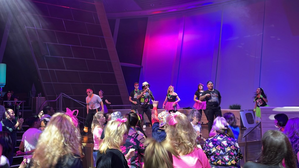 Who came here to party? Want het was tijd voor een 80’s party op het schip. De animatie-crew bracht een Flashback Dance Party op gang van 45 minuten, waarbij ze dansten op een mix van de beste 80’s nummers! Dit was gewoonweg top! Wat een energie van die mannen en vrouwen onder leiding van cruise manager Ricky. Tijdens de after-party kwamen ze ook met ons mee dansen en één van de animatoren zag zijn kans schoon om Wanda in de danscirkel te trekken. Die liet haar uiteraard niet kennen en ze deed de temperatuur richting Alaska meteen met 10 graden stijgen.