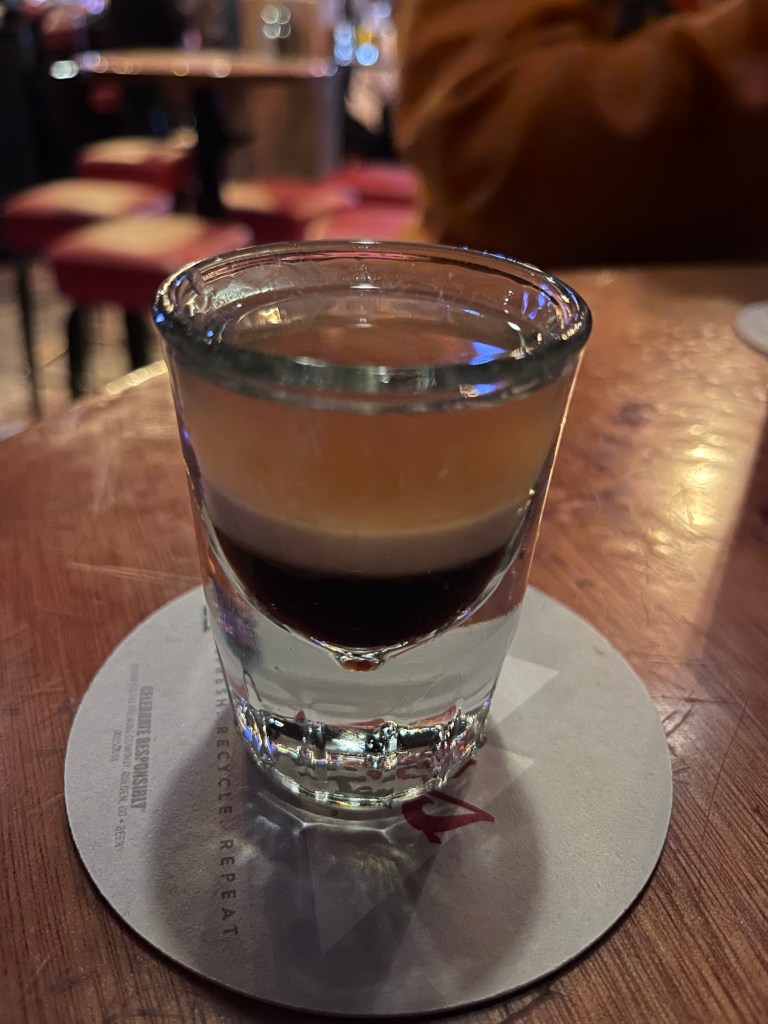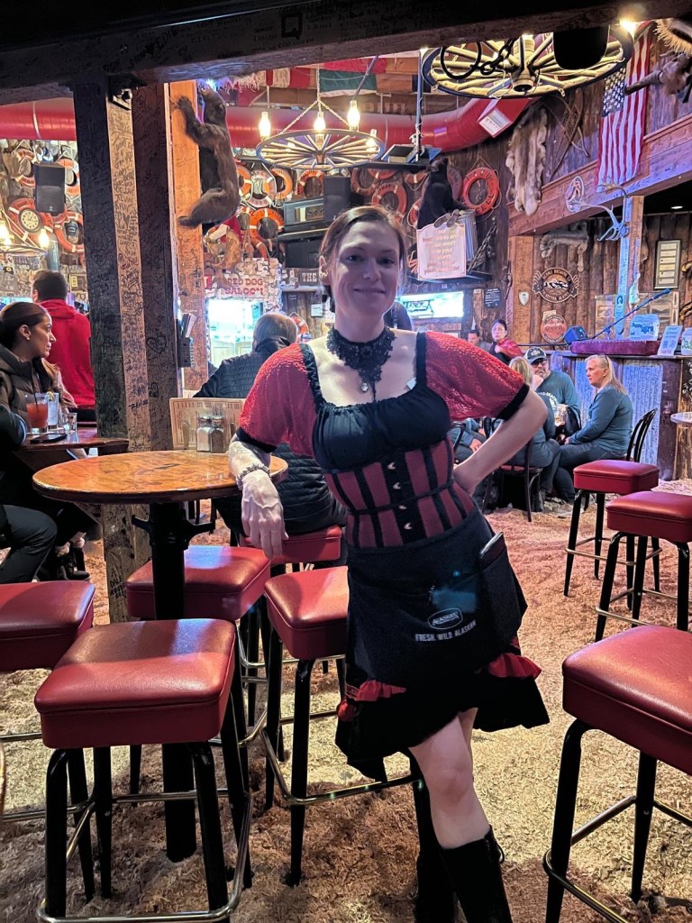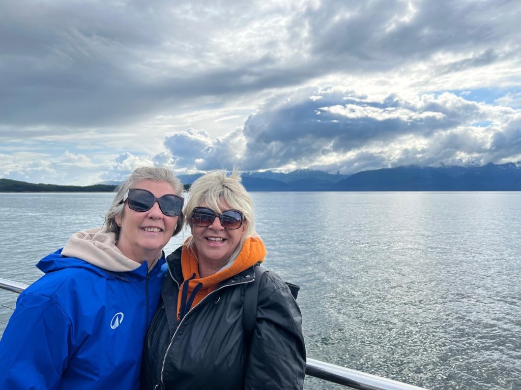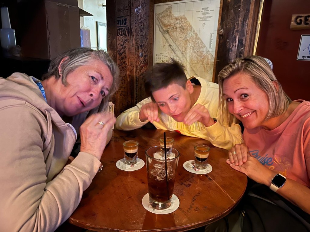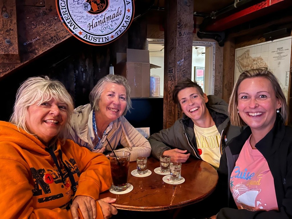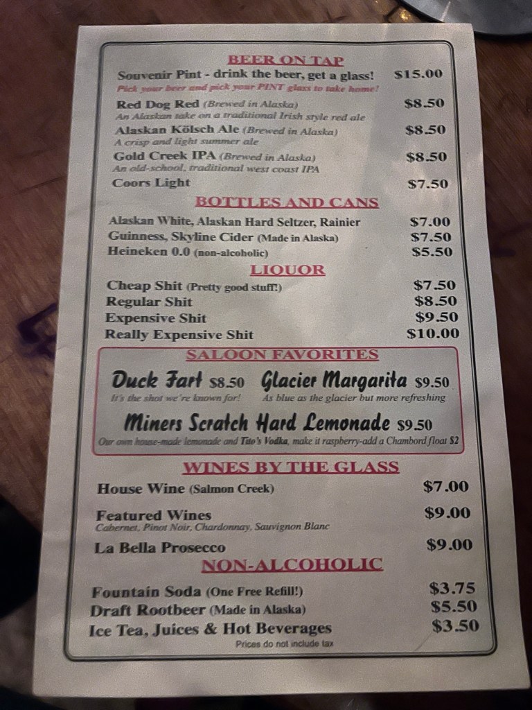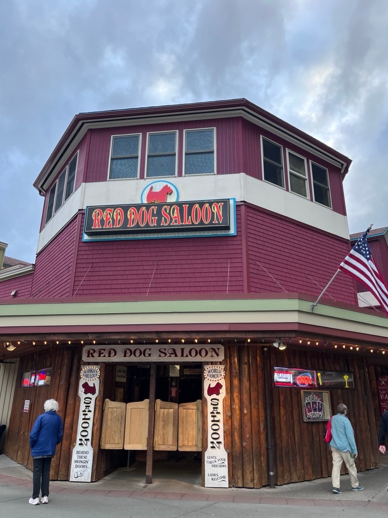 We sloten onze dag in Juneau af in de “Red Dog Saloon”. Wanda ging voor de cola en de andere Spice Girls kozen voor het bekendste “shotje” van Alaska: de “Duck Fart”. Toen de serveerster ons de shotjes kwam brengen gaf ze volgende regels mee: “no slurping, no nipping and no sharing. Kwak, kwak, knock that shit back.” Met de profetische woorden van ons bomma’ke in het achterhoofd (“eentje is geentje”) bestelden we nog een tweede shotje. We kochten ook nog wat souvenirs in het winkeltje en wandelden dan terug richting schip voor het avondeten. Dat wordt trouwens elke avond beter en beter. We werden zelfs verrast door een dansje van de ganse ploeg obers en uiteraard deden we gretig mee.