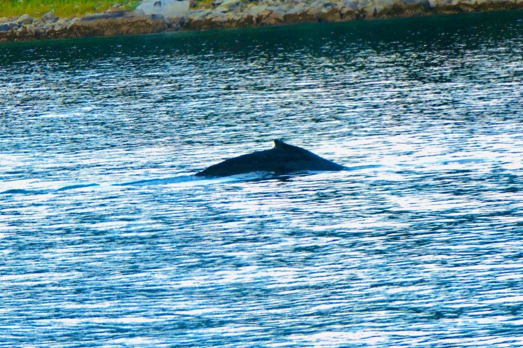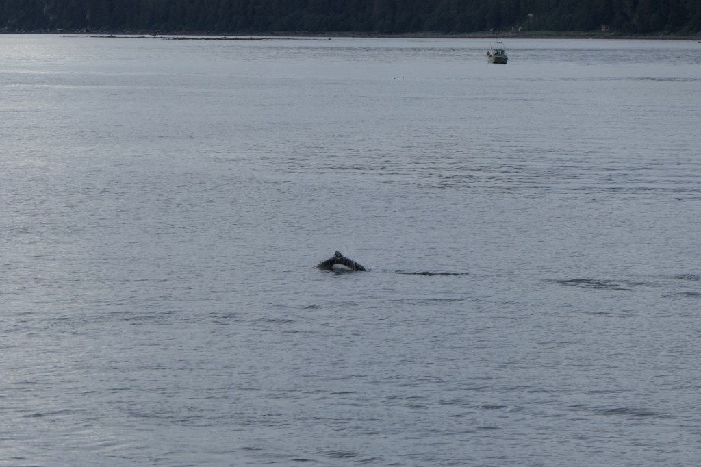 Na een fotoreportage van de gletsjer was het tijd om op een kleiner bootje te stappen voor “Whale watching & Wildlife quest”. Hyrum belde alvast naar de boot om te zeggen dat we onderweg waren en hij eindigde het gesprek met de woorden “realease the whales”. En die boodschap was duidelijk overgekomen. Na een half uurtje varen stond ons bootje op positie. Bij onze eerst stop hadden we meteen prijs: “Sasha” en haar dochter “Chacha”, twee bultruggen, lieten zich af en toe rustig zien aan de oppervlakte. Veel actie zat er echter niet in bij deze twee en dus gingen we verder op zoek. Daar hadden we meer succes. We kwamen onderweg zeeleeuwen tegen die aan het uitrusten waren op een boei en werden verrast door een school bruinvissen die langszij onze boot kwamen zwemmen en spelen. Om af te sluiten kwamen we ook nog “Kelp” tegen. Deze 21 jarige bultrug was duidelijk actief op zoek naar eten en verscheen dus hele vaak aan de oppervlakte en liet ook af en toe zijn staartvin zien. Volgens onze gids Racelle was het echt een goede dag. Jammer dat we ze geen sprong hebben zien maken, zodat we ze duidelijk konden zien.