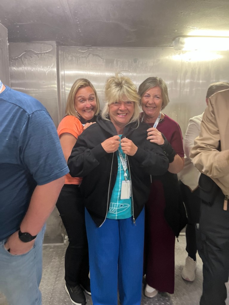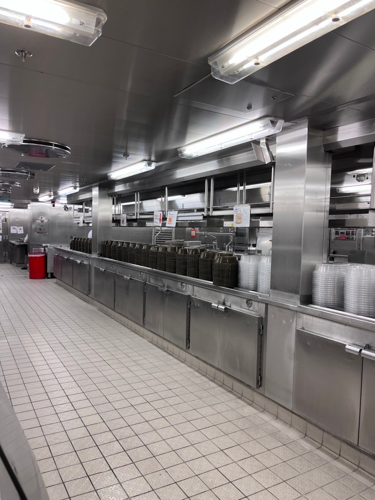 Bij de “Behind The Waves Tour” kregen we een rondleiding op de delen van het schip waar de passagiers normaal niet mogen komen. We werden gegidst door Jael uit Mexico. Ze gaf ons algemene informatie mee over het schip, de crew en de passagiers. “The Anthem of the Seas” vierde dit jaar haar tiende verjaardag. Het schip is in totaal 348 m lang en 41 m breed. Er werken 1 500 crewleden op het schip en heeft 4 180 gasten. Er zijn in totaal. 2090 staterooms of kajuiten. Alle crewleden moeten 7 maanden werken zonder één dag pauze. Jael had ook al voor andere cruisemaatschappijen gewerkt en ze is ervan overtuigd dat Royal Caribbean het meest personeelsgericht tewerk gaat. Zo delen alle crewleden per twee een kajuit die hetzelfde is als de kajuit waar wij verbleven. Het enige verschil is dat deze kajuiten niet mooi aangekleed zijn (geen tapijt, geen tv, geen mooie lampjes aan de muur). De laatste weken en maanden heeft het schip veel van haar ervaren crewleden moeten afstaan aan de nieuwe “Icon of the Seas” en de “Star of the Seas”. Dit zijn de nieuwste schepen van de rederij en zijn ook de grootste en vernieuwde schepen van de hele vloot.