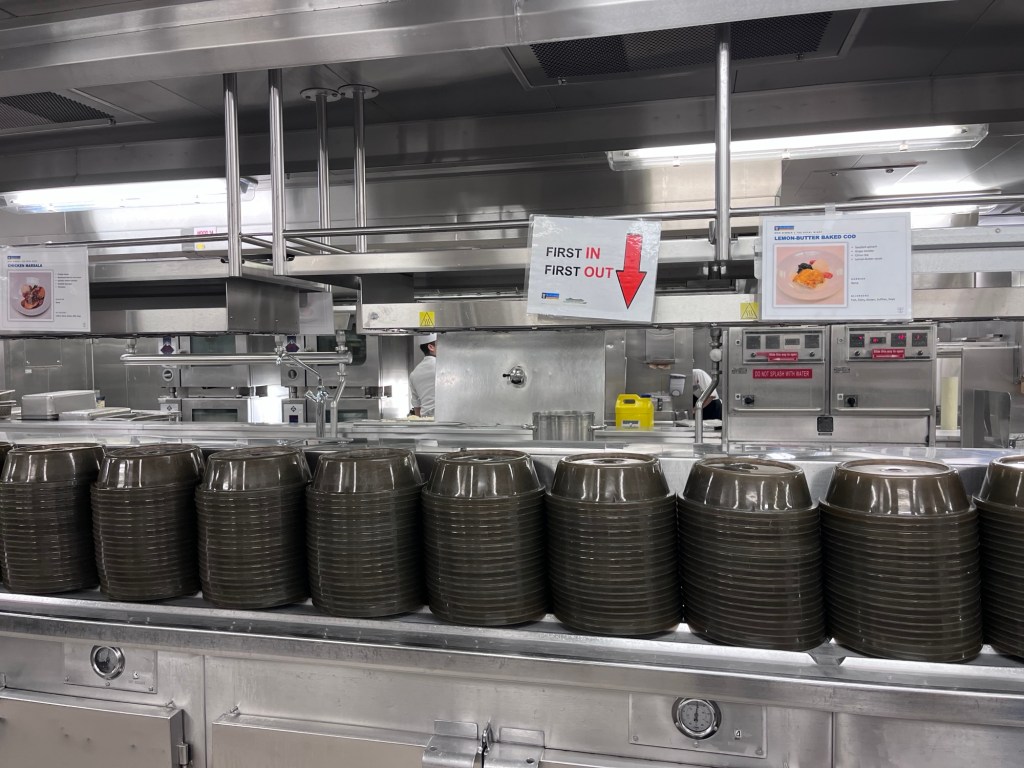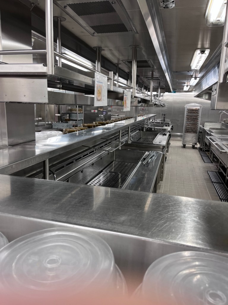 Onze eerste stop van de tour was de keuken. Er werken maar liefst 237 chefs op het schip die zorgen dat alle gasten een ganse dag eten krijgen. Enkele cijfers over de gemiddelde consumptie op het schip: 84 400 eieren, 7 250 kg kip, 20 400 kg vers fruit, 30 200 liter melk en 11 500 flesjes water, 154 000 maaltijden, 230 000 dessertjes, en zo kan ik maar verder gaan!