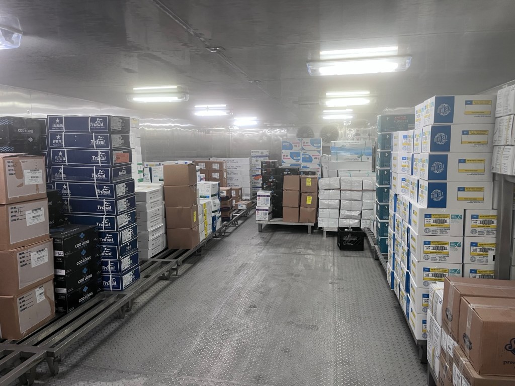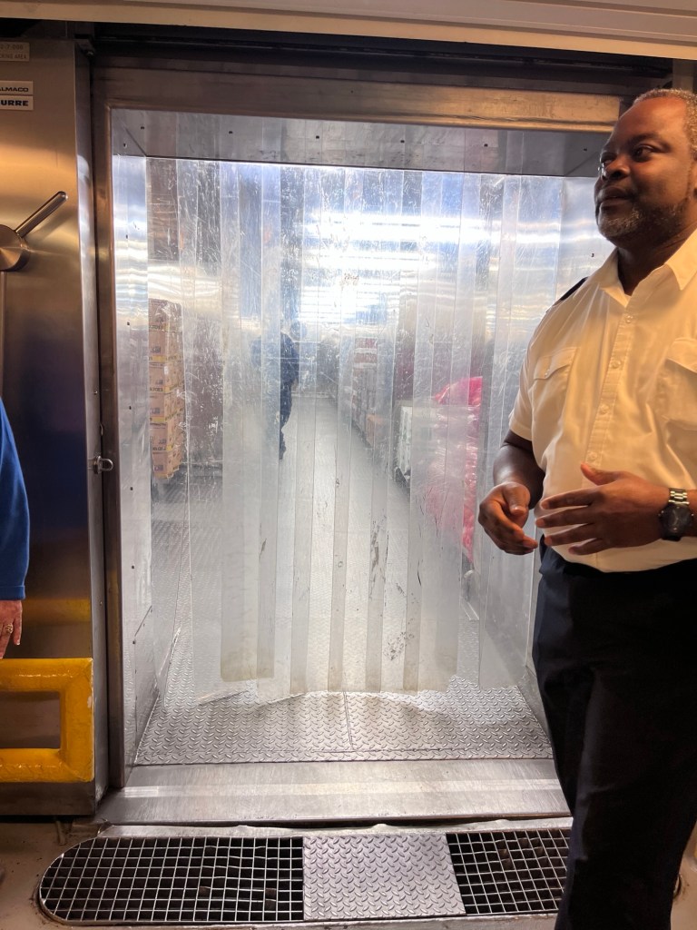 Op naar dek 2 waar enkel personeel mag komen. Hier brachten we een bezoek aan de 3 grote diepvriezers waar het eten wordt bewaard: één voor de zuivelproducten, één voor groenten/fruit en één voor vis/vlees. Eieren werden nog op een andere plek bewaard. Op dit dek bevindt zich trouwens ook de I-95, deze loopt van de boeg naar het achtersteven van het schip. Je kan dit beschouwen als de snelweg van het schip.