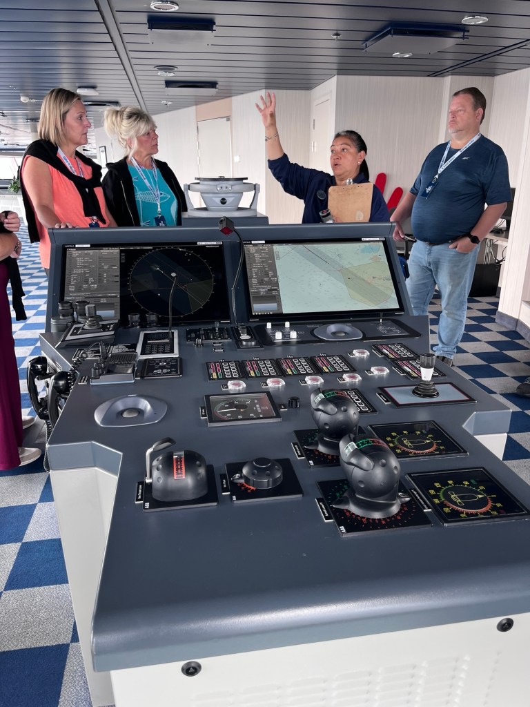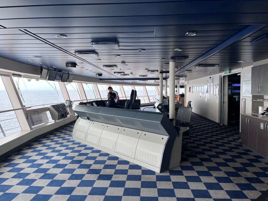 Hierna kregen we een veiligheidscontrole en wandelden we naar de “engine controle room” en naar de “bridge”. De twee belangrijkste onderdelen die het schip “up and running” houden. In de controlekamer worden de motoren van het schip nauwlettend in het oog gehouden. Zij beslissen ook of het schip trager moet varen of sneller kan varen. Op de brug doet de kapitein uiteraard zijn ding, nl. het schip besturen.