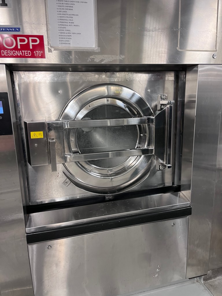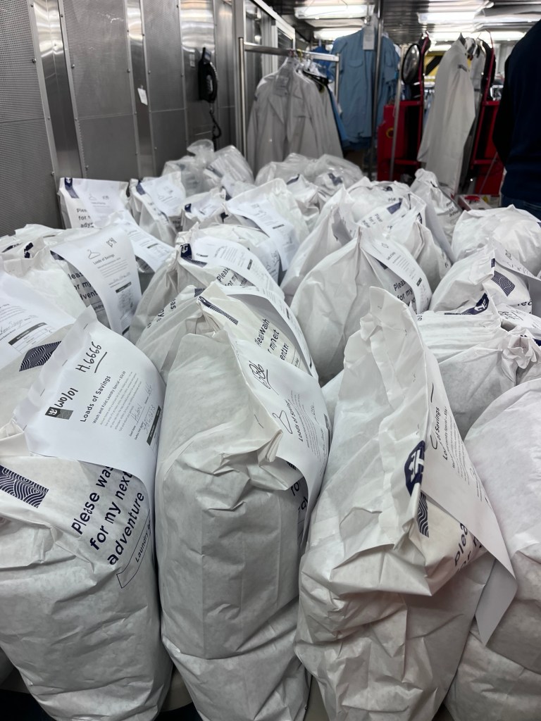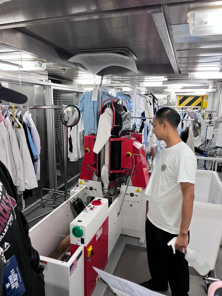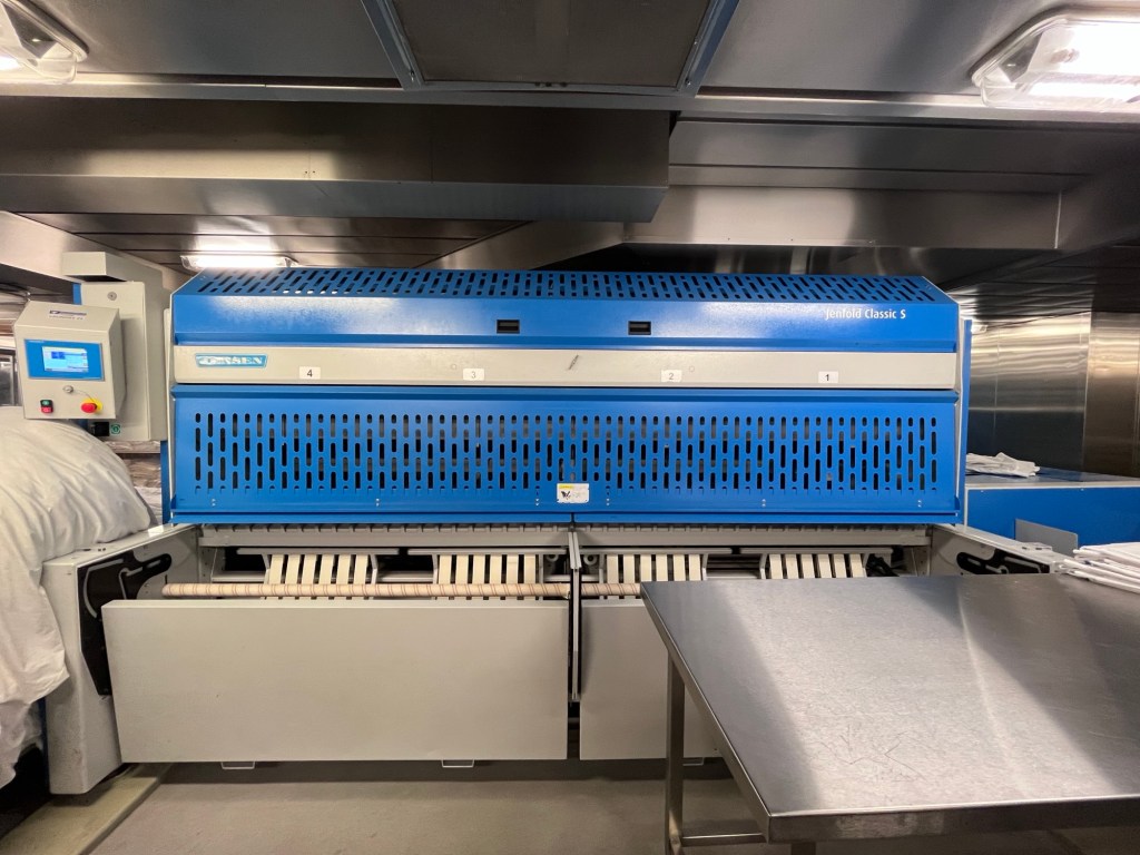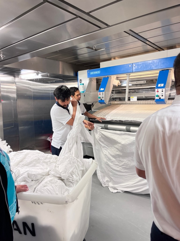 We sloten de toer af met een bezoek aan de wasserij van het schip. Hier worden beddengoed, handdoeken, uniformen en ook kledij van de gasten gewassen, gedroogd en gestreken. Vooral voor het strijken stonden er een aantal toestellen binnen, die wij ook best interessant vonden.