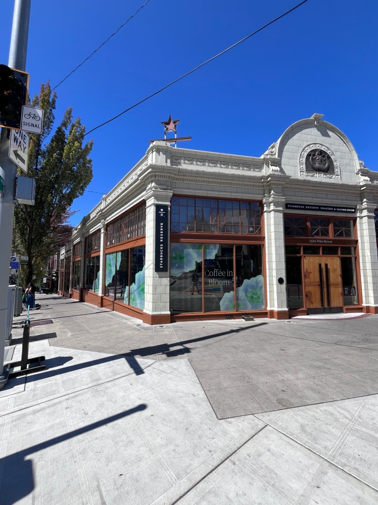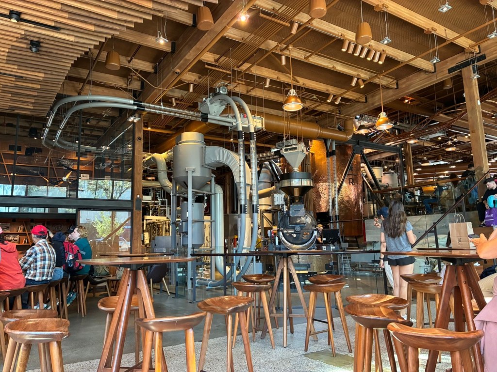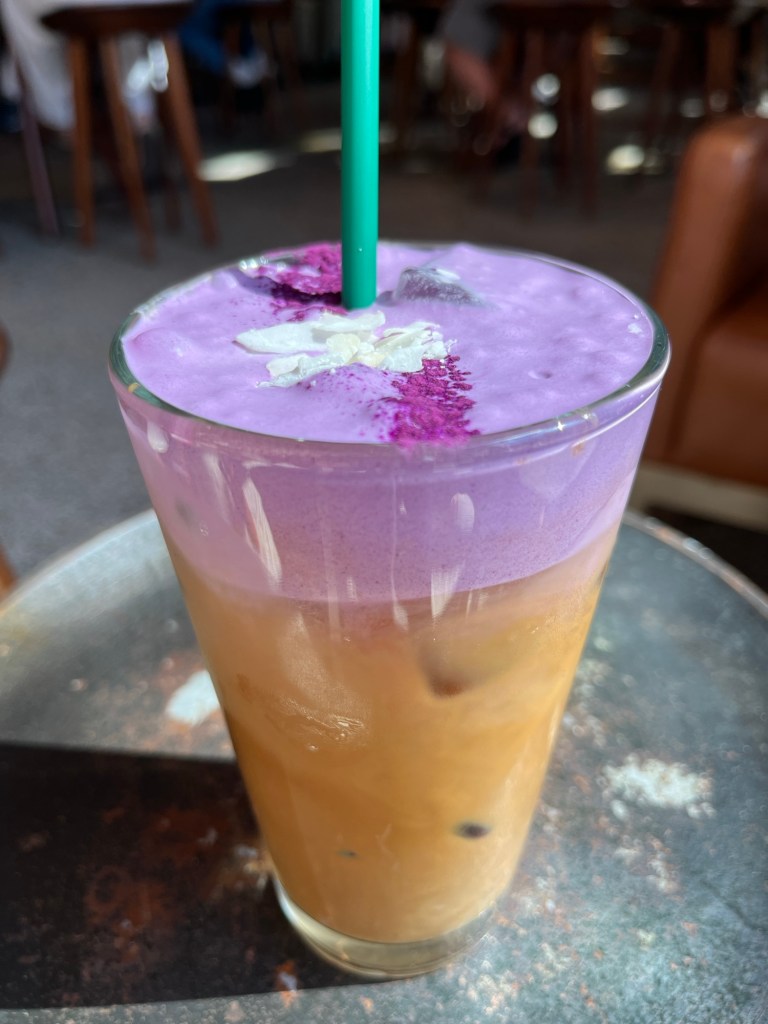 Na het inchecken wandelden we naar de “Starbucks Reserve Roastery” voor een lekkere koffie en om wat te bekomen van de drukte deze ochtend. Maar ook hier moesten we Disney-gewijs aanschuiven om onze bestelling door te geven. Na 25 minuten was het aan ons. Vanessa koos voor een “Toffee Nut Latte” en Viviane en ik voor een “Iced Ube Coconut Latte”. Wanda koos voor een eenvoudig glas melk. En dat het lekker was! Jammie jammie!